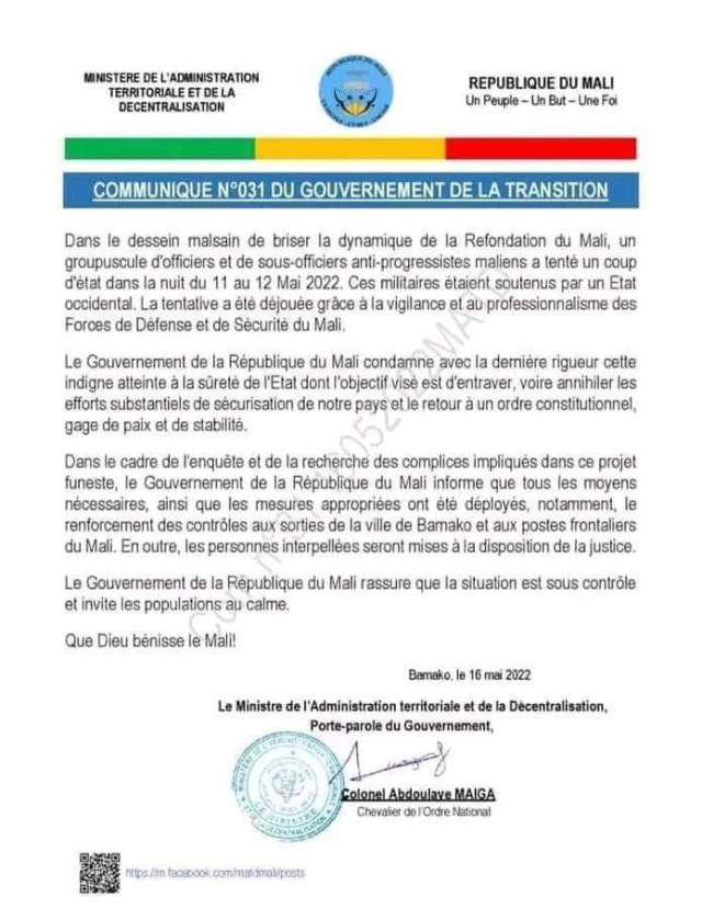 Le gouvernement malien affirme avoir déjoué un coup d’État dans la nuit du 11 au 12 mai 2022. À la Une Afrique 16 mai 202216 mai 2022La rédactionvoici le communiqué du gouvernementPartager