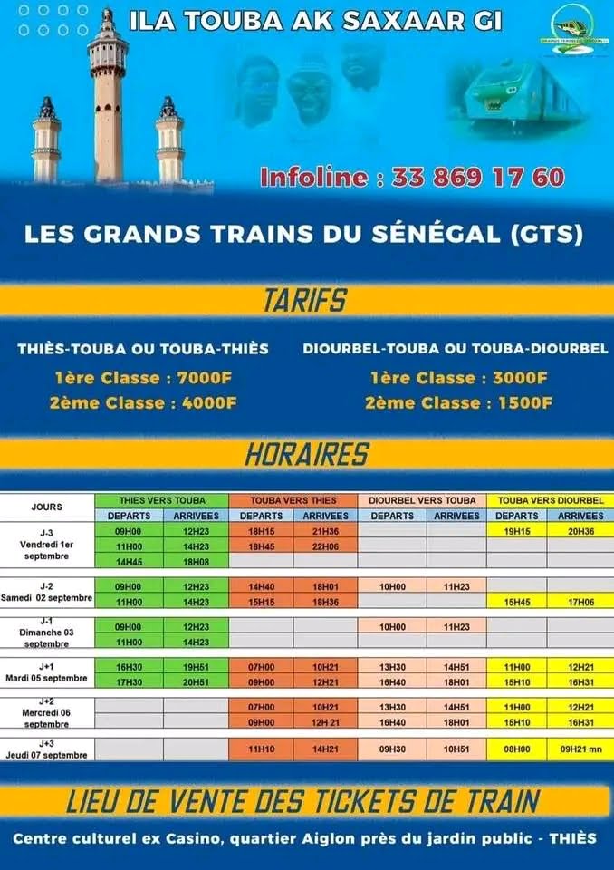 Ce premier train a rallié Touba à partir de la gare de Thiès via Diourbel. Durant cette édition du grand Magal de Touba, des trains vont desservir les régions de Thiès et Diourbel pour convoyer des pèlerins.Le ministre des Infrastructures, des Transports terrestres et du Désenclavement, Mansour Faye, avait effectué il y a quelques jours le voyage inaugural des liaisons ferroviaires entre Thiès et Touba. Des tests avaient été effectués à cet effet pour s’assurer des performances du train.