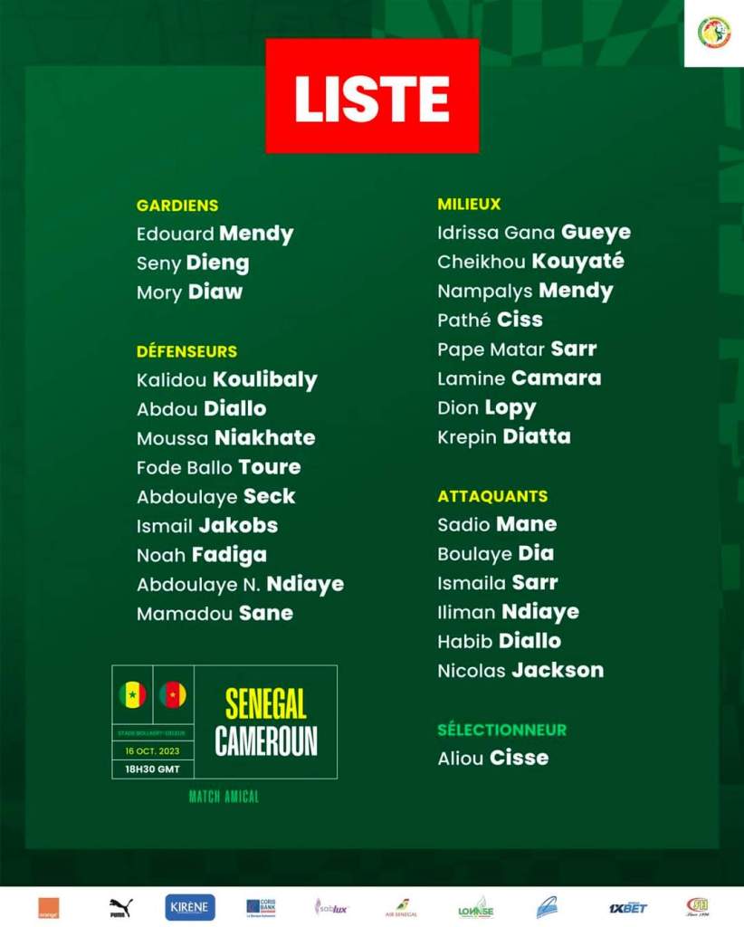 La liste des 26 joueurs retenus par le sélectionneur national Aliou Cissé pour le match amical international contre le Cameroun prévu le 16 octobre 2023 à Lens.Articles similairesPartager 2023-10-06