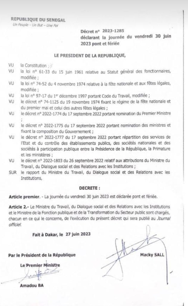 Le président Macky SALL décrète la journée du 30 Juin 2023, correspond au lendemain de la fête d’Eid d’El Kabir (Tabaski), fériée