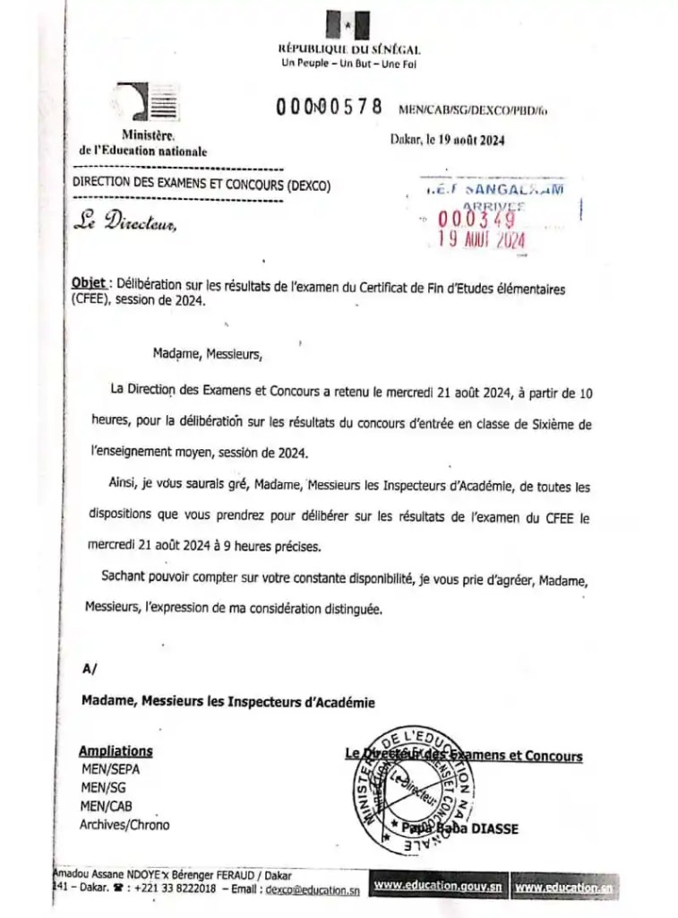 Dans un document publié, parvenu à Canalactu, ce lundi 19 août 2024, le Ministère de l’Éducation nationale, par l’intermédiaire de sa Direction des Examens et Concours (DEXCO), annonce que les délibérations des résultats du Certificat de Fin d’Études Élémentaires (CFEE) pour la session 2024 se tiendront le mercredi 21 août 2024.