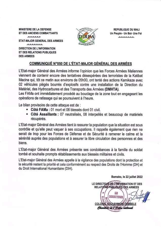 Mali : Communiqué de l’Etat-major Général des Armées du vendredi 22 juillet 2022-Attaque de la Caserne de Kati.