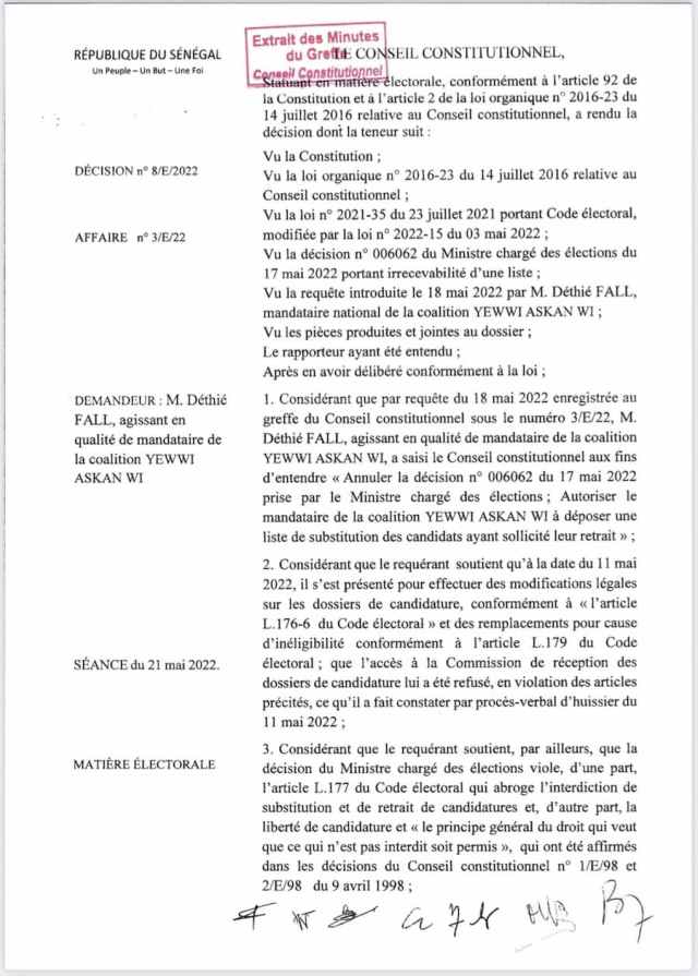 Pour rappel, ce recours a été introduit par Déthié Fall, mandataire national de la coalition Yewwi Askan Wi le mercredi 18 mai dernier.