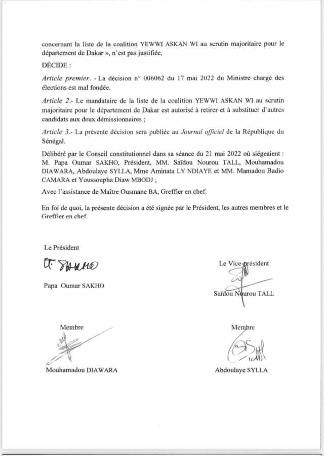 Le Conseil constitutionnel a rejeté la décision de la DGE contre la liste de Yewwi Askan wi. Le juge chargé de se pencher sur ces affaires politiques a donné sa décision concernant la demande visant l’annulation des décisions de rejet de la liste départementale de Yewwi Askan Wi à Dakar, déposée par la Direction générale des élections. Les cinq sages ont rejeté la requête parce que, disent-ils, les arguments évoqués ne sont pas valables.