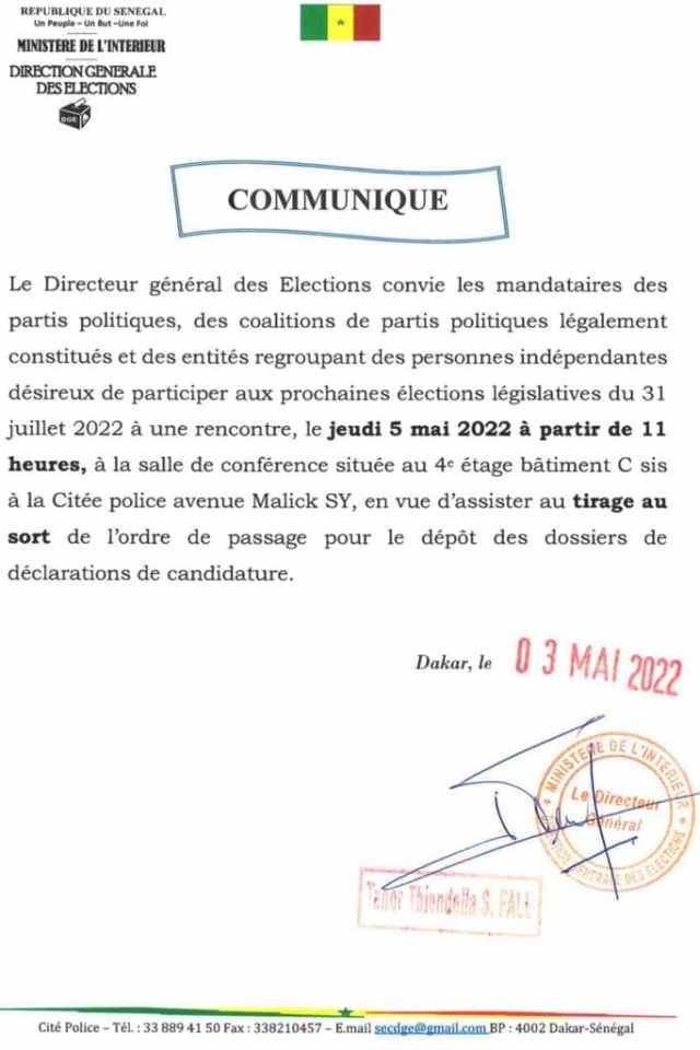 Ains, « La direction générale des élections informe les partis politiques, coalitions de partis politiques et candidats indépendants que leurs mandataires peuvent se présenter jeudi 05 mai dans leurs bureaux pour assister au tirage au sort de l’ordre de passage pour le dépôt des déclarations de candidature », lit-on dans un communiqué de l’organe de gestion du processus électoral.