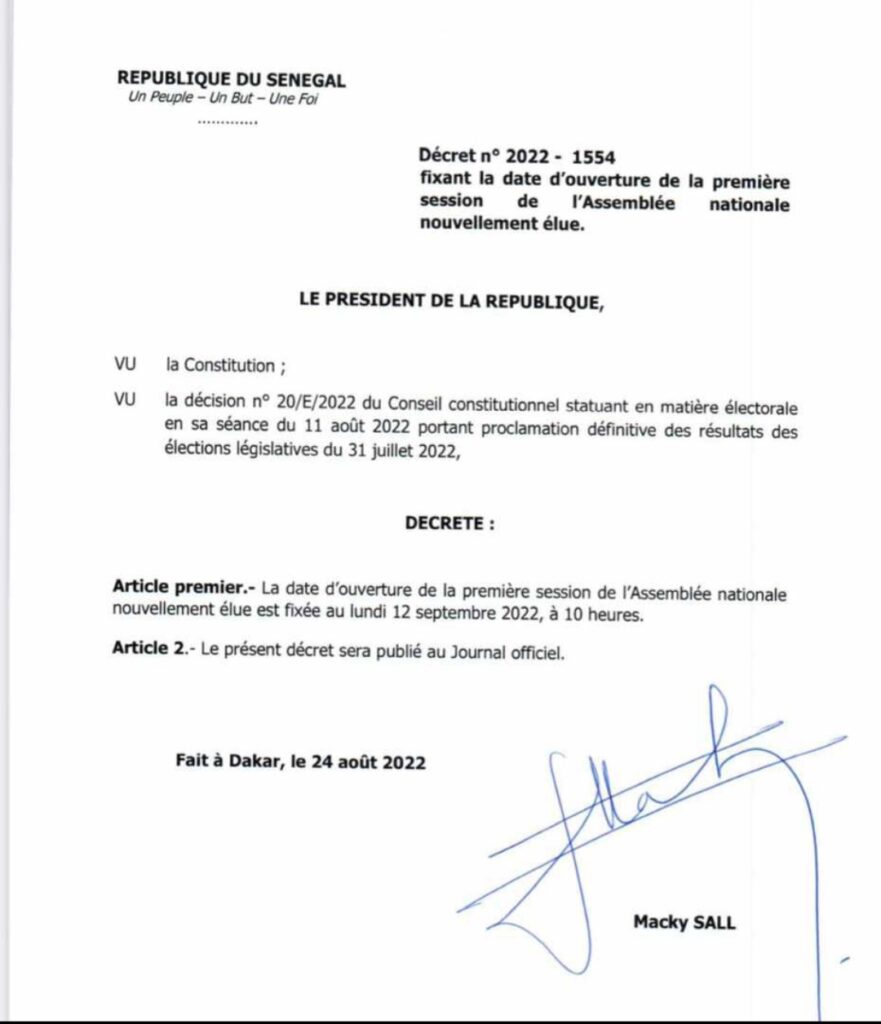 Après les élections législatives du 31 juillet 2022, la première session de la 14 ème législature se tiendra le lundi 12 Septembre 2022.Voici le décret présidentiel :Décret présidentiel fixant la date d’ouverture de la première session de la 14 ème législature de Sénégal.Partager 2022-08-24