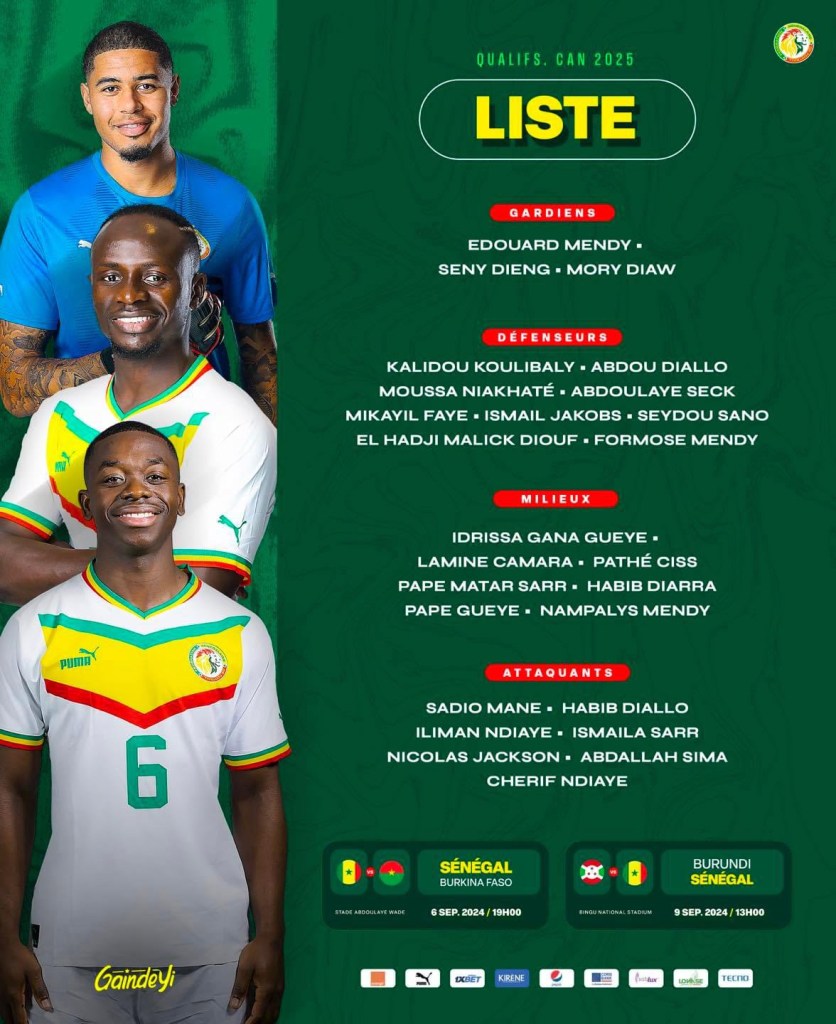 Liste des lions sélectionnés par Aliou Cissé pour les matchs Sénégal vs Burkina Faso et Burundi vs Sénégal, comptant pour les 1ère et 2ème journées des éliminatoires de la CAN 2025.