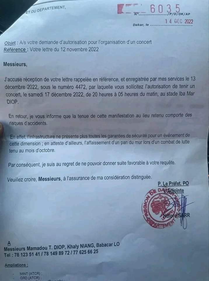 «La raison est d’ordre sécuritaire liée à la vétusté du stade Iba Mar Diop qui ne peut plus abriter certaines manifestations et l’histoire récente le démontre à suffisance», a déclara le préfet de Dakar. M. Tine d’expliquer : «Recemment, il y a un combat de lutte qui s’est tenu là-bas et il y a eu des violences occasionnant des blessés. Avant cela, il y a plusieurs missions de protection qui ont démontré avec preuves à l’appui que le stade n’est plus au norme. Dans ces conditions, on ne peut autoriser un concert».