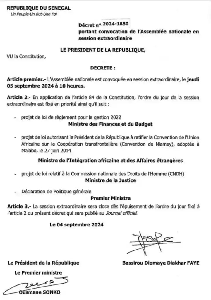 Le président de la République Bassirou Diomaye Diakhar Faye, a, par décret en date du 4 septembre, saisi l’Assemblée nationale pour l’ouverture, jeudi, à partir de 10 heures d’une session extraordinaire, a appris l’APS, de source officielle.