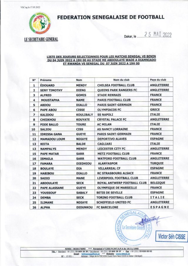 liste des joueurs sélectionnés par Aliou CISSE pour les deux premières journées des éliminatoires de la CAN 2023 À la Une Sport 27 mai 202227 mai 2022La rédactionLe regroupement de l’équipe démarre le 30 mai 2022.Partager