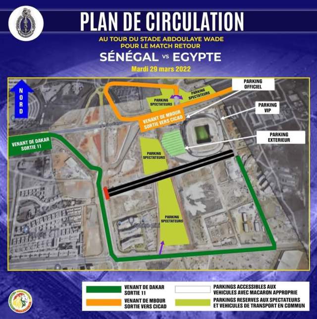 Sénégal vs Égypte : plan de circulation établi par la gendarmerie autour du Stade… À la Une Sport 28 mars 202228 mars 2022La rédactionPlan de circulation établi par la Gendarmerie Nationale au tour du Stade Abdoulaye Wade à l’occasion du match Sénégal vs Egypte de ce mardi 29 mars 2022👇Partager