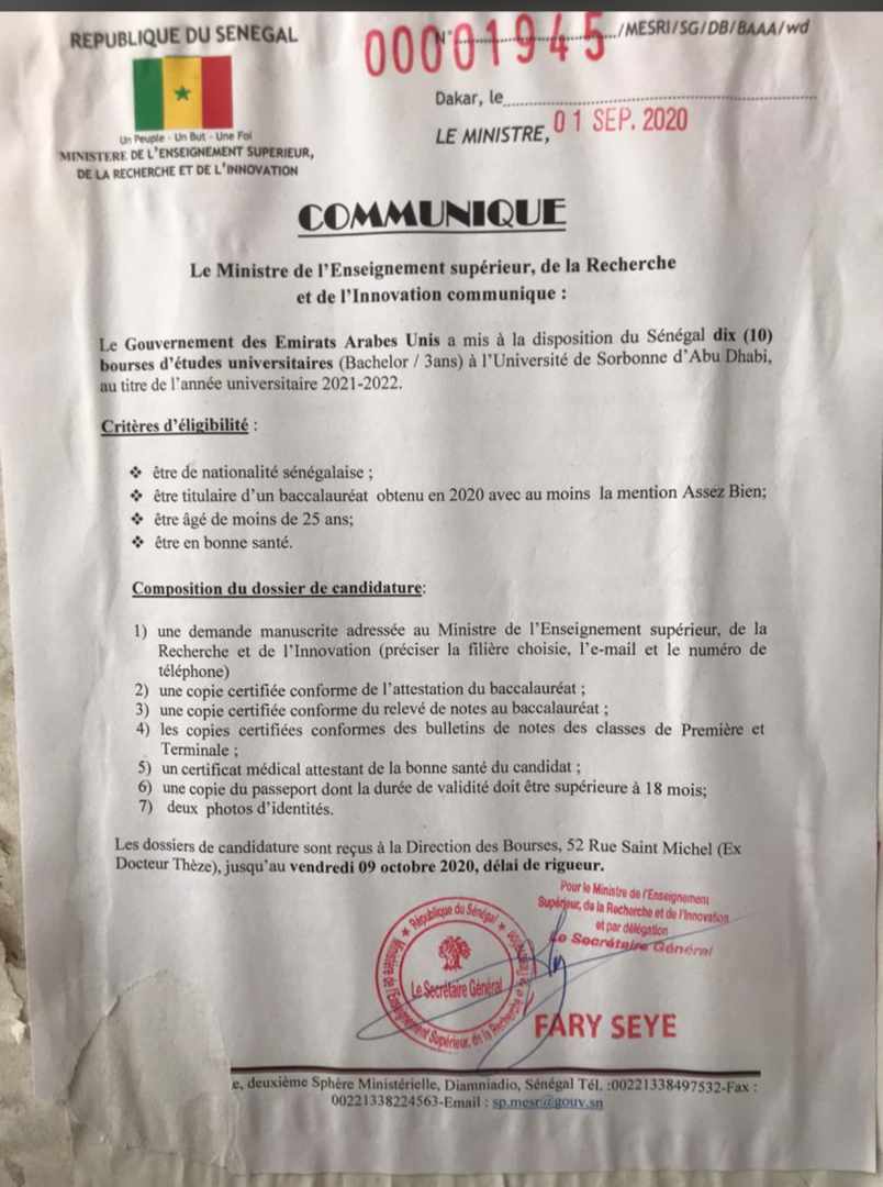 Examen et Concours Examens et Concours : 10 bourses d’études universitaires à Abu Dhabi… 8 mois ago Canalactu Partager Tags: Bourses d'étudesContinue ReadingPrevious Office du Bac : Communiqué sur les épreuves du 2nd groupe qui débutent ce Jeudi…Next Pour les nouveaux bacheliers… À lire aussi Examen et Concours Urgent : Recrutement à l’UCAD (photos) 2 mois ago Canalactu À la Une Examen et Concours Urgent-gendarmerie nationale : ouverture de la période de dépôt des candidatures aux concours des sous-officiers (photo) 2 mois ago Canalactu À la Une Examen et Concours urgent : Recrutement massif au sein de la gendarmerie nationale 2 mois ago Canalactu