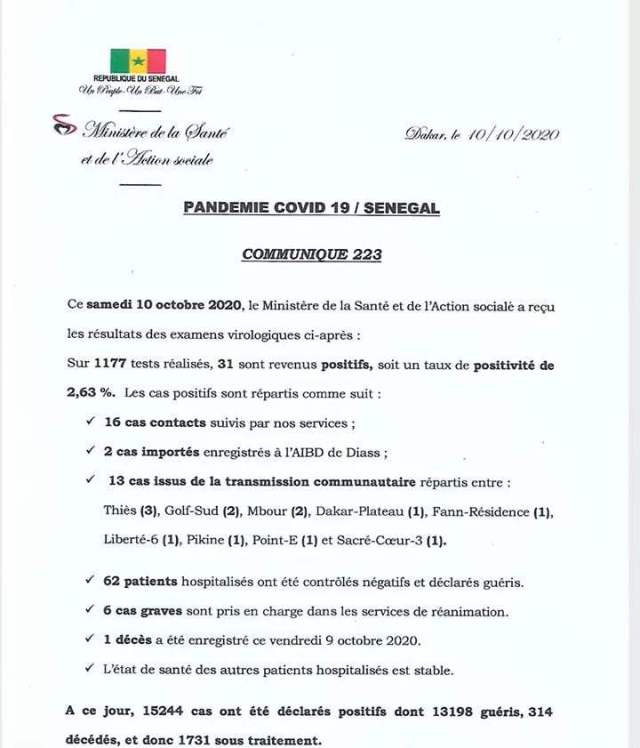 Coronavirus : 31 nouveaux cas positifs ce Samedi 10 Octobre 2020 au Sénégal | Communiqué… Santé 10 octobre 202010 octobre 2020CanalactuPoint de situation Coronavirus : 31 nouveaux cas positifs ce Samedi 10 Octobre 2020 au SénégalPartager